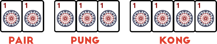 Blocks are groups of between 2 and 4 identical tiles. Block types are named as in American Mah Jongg: Pair (2 tiles), Pung (3 tiles), Kong (4 tiles).